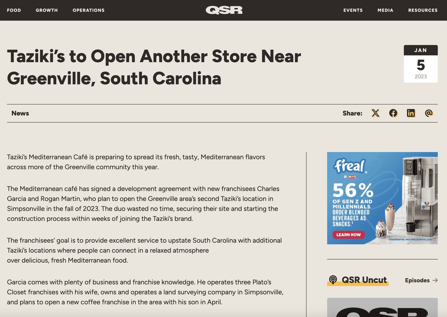 QSR: Taziki's to Open Another Store Near Greenville, South Carolina