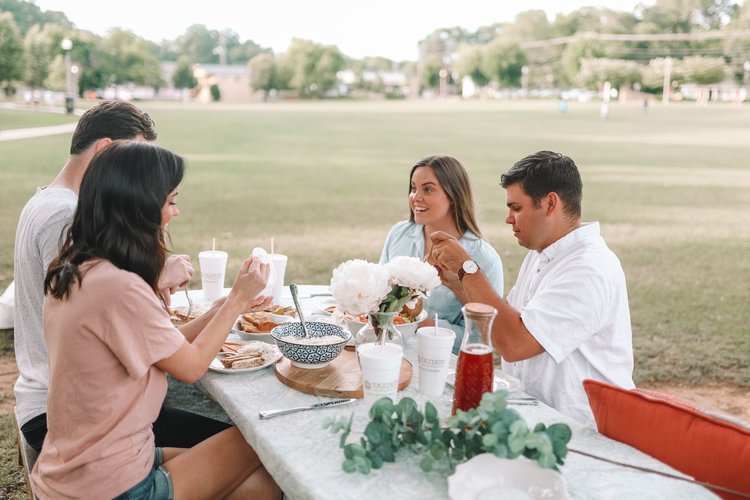 Summers come and summers go. But, this summer, Thomas and I have decided to make the most of the opportunities to gather, spend time with friends, invite people into our “every day” and do small things well. Yes, traveling, beach trips and vacations are so much fun but being home isn’t too shabby either (if you make it fun). Picnics are a great idea! Grab a quilt, grab your friends and family, and head to your local park or favorite spot with your favorite meal. For me, it was a no-brainer to grab some of our favorites from Taziki’s Mediterranean Cafe for our picnic! Grilled chicken, rice, Greek salad, Taziki’s sauce, and pita is the best combination for any type of eater (picky or not) and easy to grab and go for a “luxury” picnic dinner. Don’t forget to grab cookies with your order because we all know the most important part of a picnic is dessert!