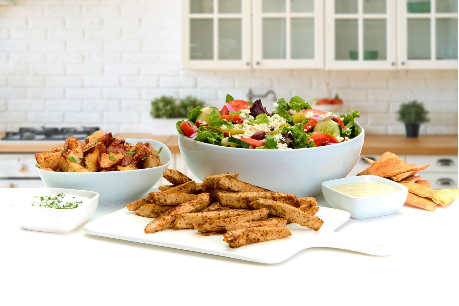 The article details our protein selections, including grilled chicken, chargrilled lamb, beef, chicken kabobs, grilled shrimp, and salmon, paired with our Classic Greek Salad, choice of pita bread, and side options.